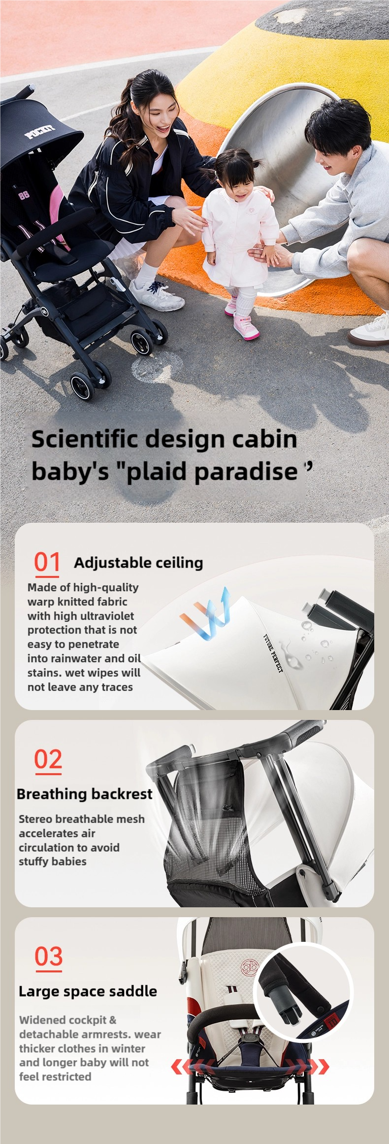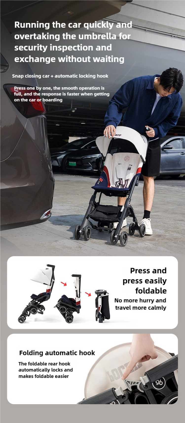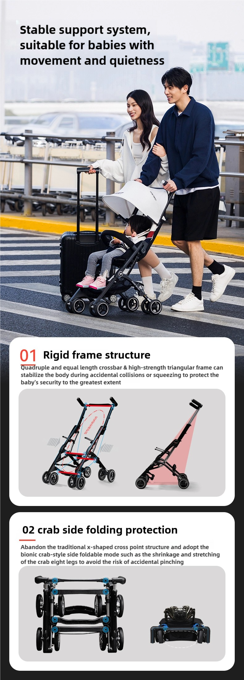 A more luxurious travel experience. Folded within one seconds, this ultra-compact stroller is easy to stow in an overhead compartment, so you can relax and enjoy the flight.